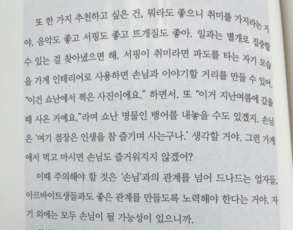 - "체인점이 아니라 '내 가게'를 운영한다면 직원을 뽑을때 ' 얼마나 성실한가?' 보다 '손님들을 즐겁게 해줄 수 있는가?'를 보는게 훨씬 중요해'