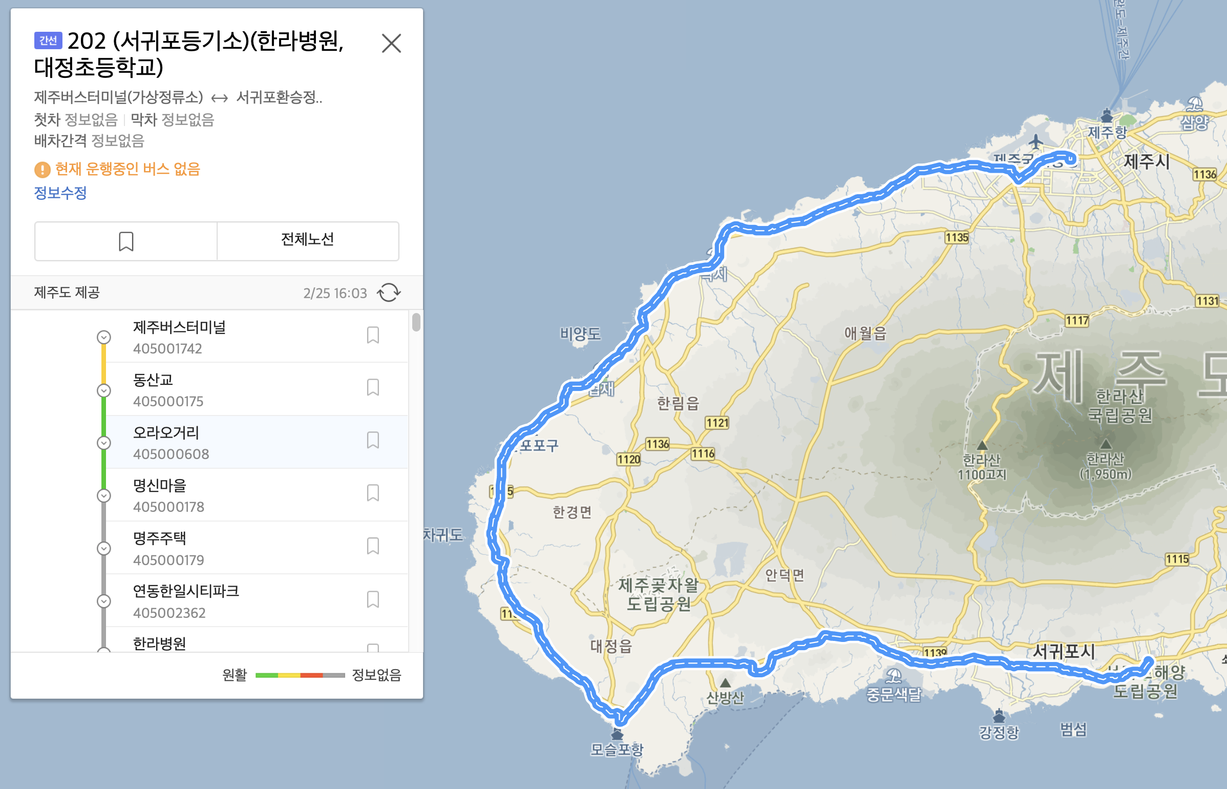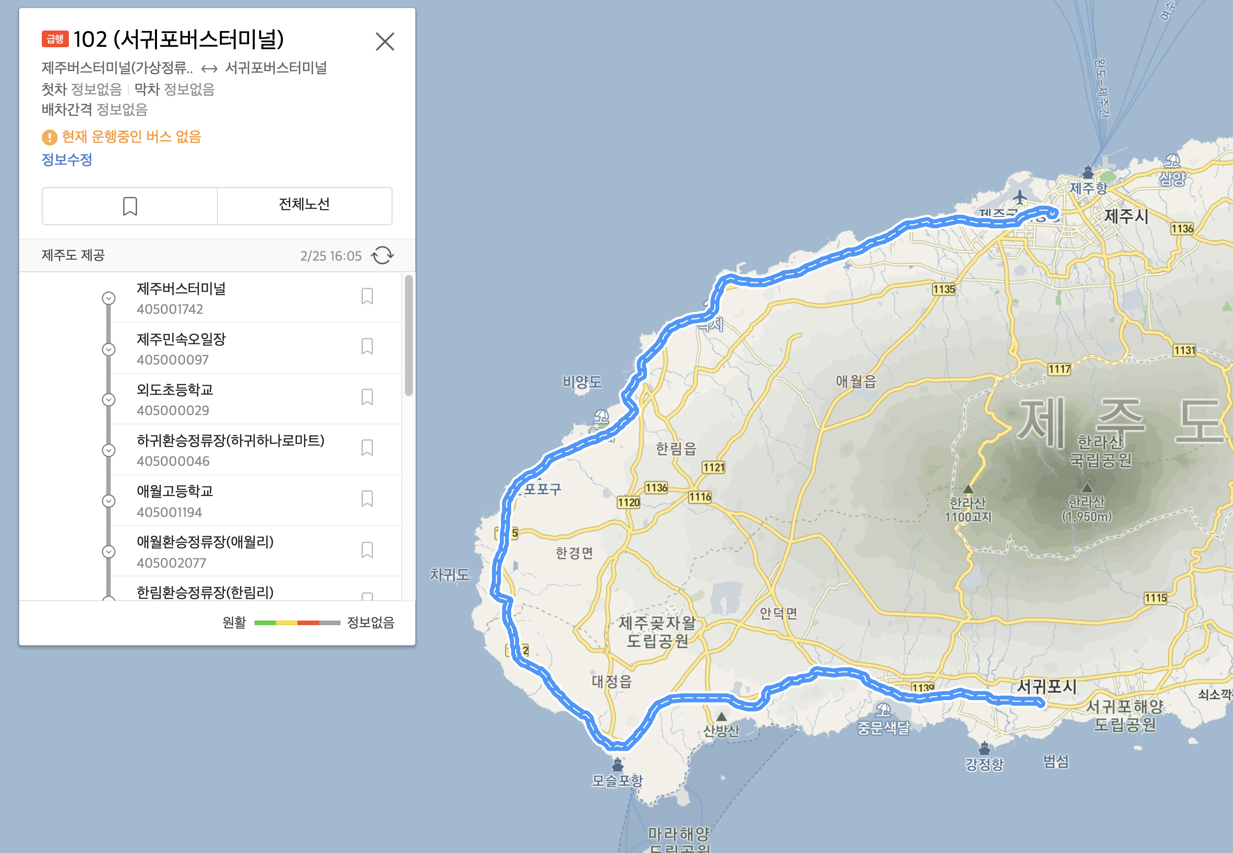 | 제주터미널 | 공항 | 오일시장 | 하귀하나로마트 (경유) | 하귀초등학교 (경유) | 애월 | 한림 | 신창 | 고산 | 대정읍사무소 | 화순 | 중문 | 서귀포터미널 |